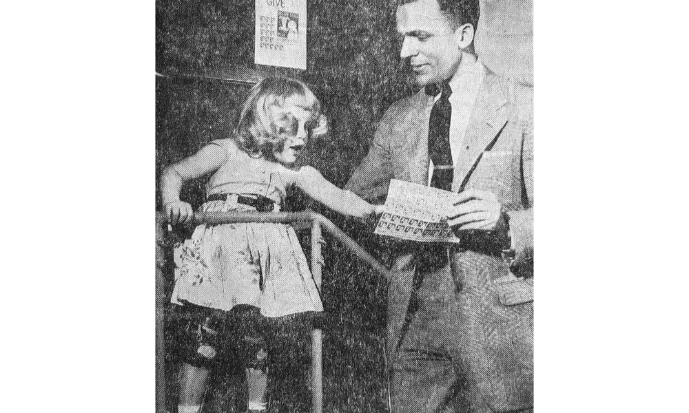 Kanawha ‘Easter Seal’ Girl: “Valery Ann Bayless, daughter of Mr. and Mrs. Robert Bayless of Poca, is Kanawha County ‘Easter Seal Girl’ for 1956. Valery is shown with Lyell B. Clay, city solicitor who is representing Mayor Copenhaver as he purchases the first 1956 Easter Seals. The Cerebral Palsy Clinic located at 509 Lee St. in the Fruth School building is the chief services project of the Kanawha County Society for Crippled Children and Adults, Inc. Here, 75 children like Valery receive treatments in physical therapy, occupational therapy and speech therapy.”