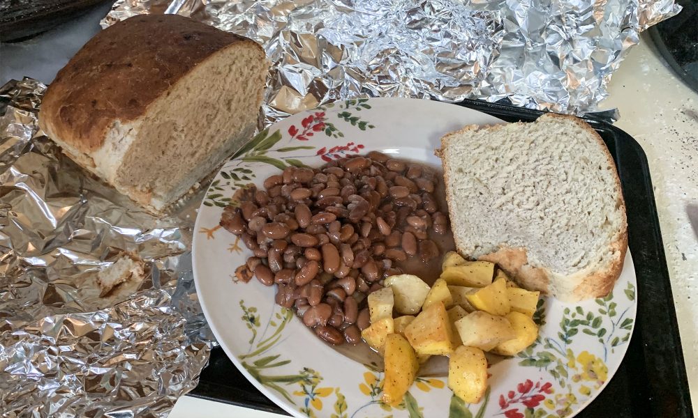 I had a few potatoes on hand that I had dug a few weeks ago but there were also some in the ground which were volunteers that sprouted from unharvested 2023 spuds. Why not unplanned potatoes to go with unplanned pinto beans? Why not make the entire meal unplanned? I liked the idea but man shall not live by taters and beans alone. How about some bread? I had all the ingredients for bread on hand. My regular bread and rolls do not really qualify as an unplanned production because I plan to be ready to respond Betsy’s bread requests which are often.