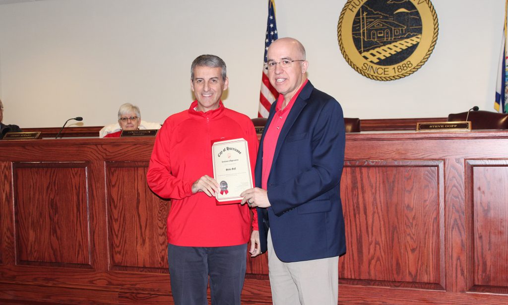 Mayor Scott Edwards (right) presents a certificate of recognition to Matt Stevens.
