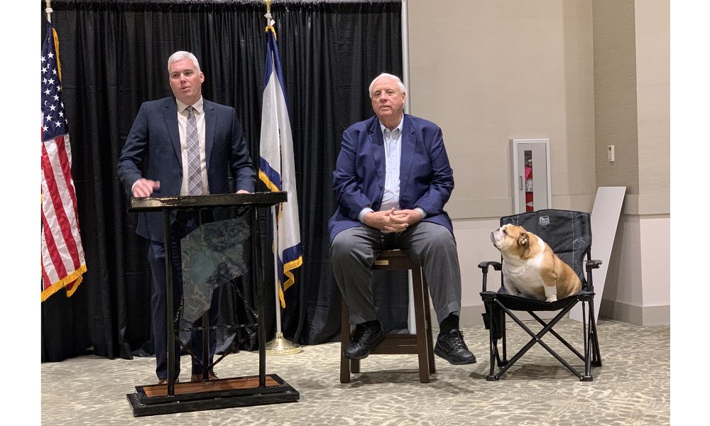 County Commissioner Andy Skidmore (left) introduced Governor Justice (center). Baby Dog (right) needed no introduction.