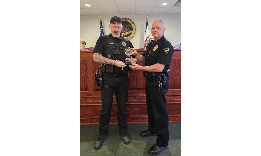 Hurricane Police Chief Mike Mullins (right) presents Officer Payton Carr with the Officer of the Year Award for 2024.