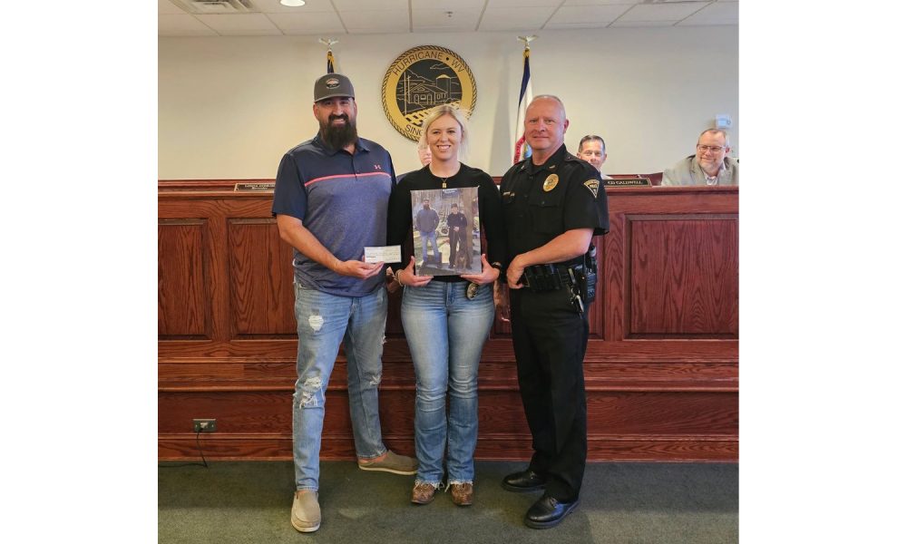 The Hurricane City Council met on Monday, June 2, to hear updates from city officials and to conduct regular business. Prior to the updates, the council recognized two HPD officers, Patrolman Billy Vickers and Corporal Brett Johnson, for service, above and beyond, normal duties. Vickers aided a motorist with a flat tire on I-64 by removing the tire, purchasing a replacement, and installing the new tire. Johnson, upon seeing a woman struggle to mow a lawn while toting a baby carrier and baby, finished mowing the large lawn.