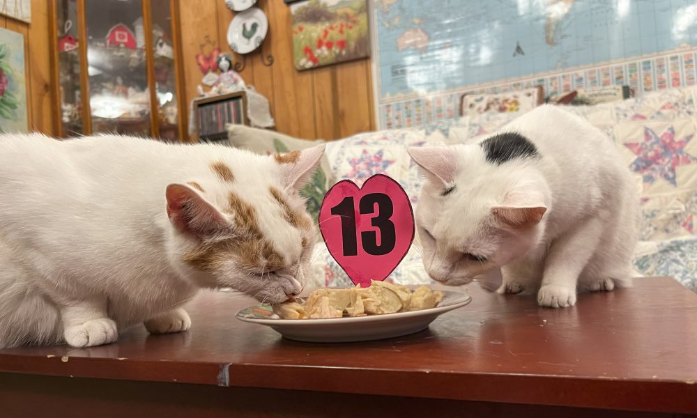 Parallel and Black Spot are now officially teenagers! They celebrated their 13th birthday on June 14 with a tuna “cake” and treats. They are brother and sister who were born in the kitchen closet here at the Breeze. There were two other kittens in the litter – Captain Morgan and Shadow. Captain Morgan decided to go off in search of adventure many years ago, and Shadow passed away last summer from health issues.