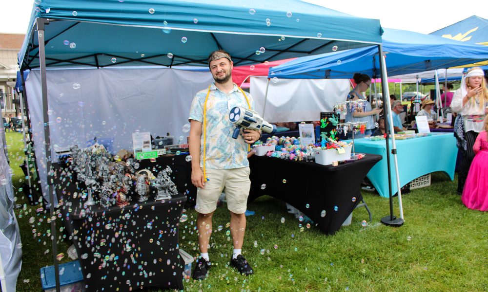 Chris Francis of Element 304 Printing and Miniatures uses his bubble gun to create showers of bubbles for visitors.