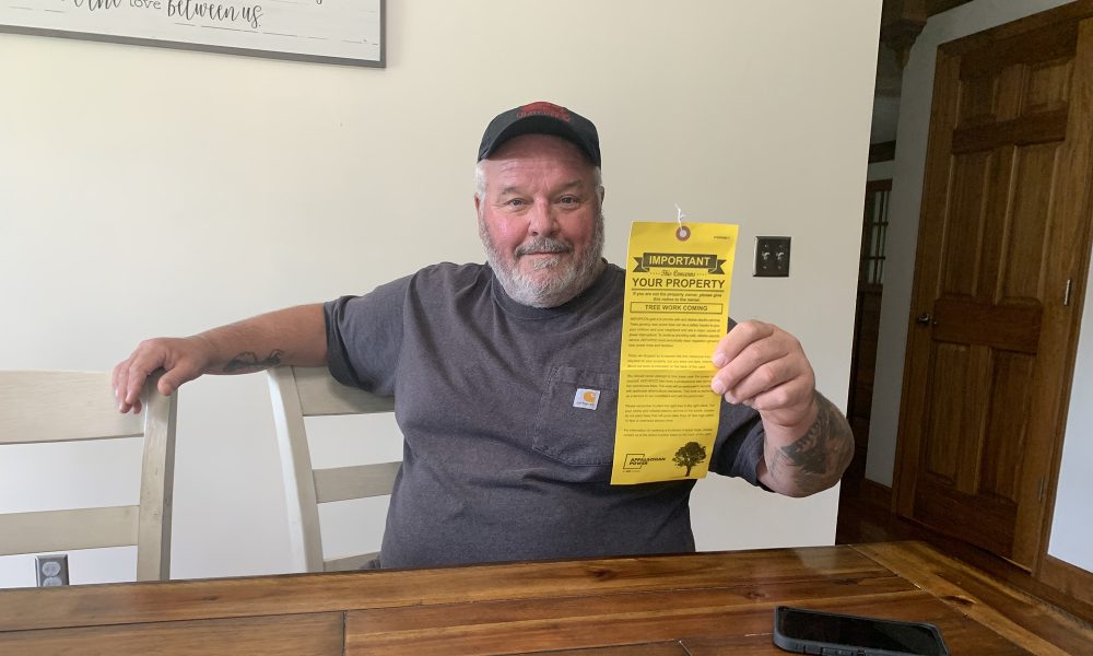 Bill Hatcher displays a notice informing him that unnamed contractors will be visiting his property at an unannounced hour at some future time.