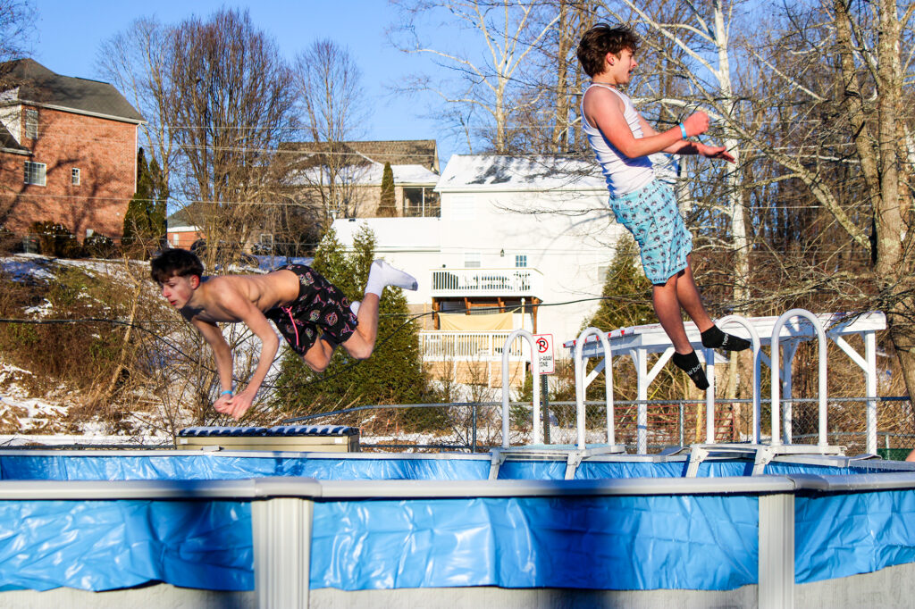 The pool was filled with water on Friday and froze overnight requiring 1-inch thick ice to be broken up and removed prior to the 5 p.m. jumping time. In the previous nine years of the event at City Park, ice removal has been required only on one occasion. Ice opening and removal is a regular occurrence in West Virginia Polar Plunges when the event is held at lake sites or other natural settings.